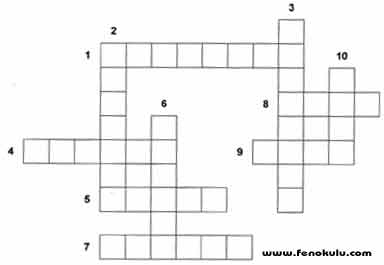 SORULAR: 1) Maddelerin iç yapısı bütünüyle değişir, yeni ürünler meydana gelir ve basit yöntemlerle eski durumlarına dönüştürülemeyen olay veya tepkime. 2) Aynı özellikte iki maddenin bir araya gelmesi sonucu oluşan madde . 3) Atomun çekirdeği etrafında hızlı hareket eden (-) yüklü parçacık. 4) Metallerin diğer metallerle ya da ametallerle oluşturduğu homojen karışım. 5) Elektriği ve ısıyı iyi ileten tel ve levha haline getirilebilen elementler. 6) Elektriği iletmeyen, tel ve levha haline getirilemeyen elementler. 7) Simgesi He olan element. 8) Maddenin üç halinden biri. 9) Simgesi Cr olan element. 10) Birkaç türü birleşince çeşitli kimyasal bileşikleri, bir türü ise bir kimyasal öğeyi oluşturan parçacık.