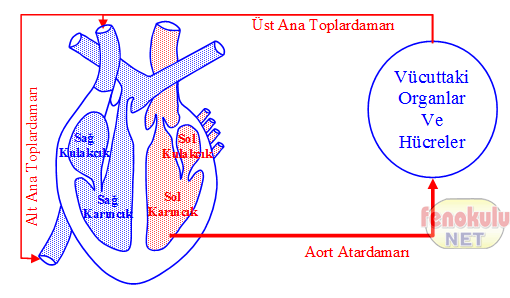 Kalbin sol karıncığındaki temiz kanın, aort atardamarı ile vücuttaki bütün hücrelere pompalanıp, vücutta kirlendikten sonra alt ve üst ana toplardamarları ile kalbin sağ kulakçığına getirilmesine büyük kan dolaşımı denir. Büyük kan dolaşımı, temiz kanın hücrelere iletilmesi ve hücrelerde kirlenen kanın toplanması için yapılır.