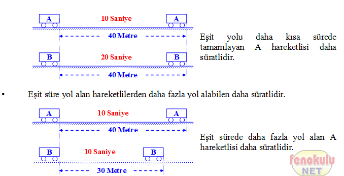 ▪ Hareket süresi ve aldığı yollar eşit olmayan hareketlilerin süratleri karşılaştırılırken sadece zamana veya sadece alınan yola bakmak yeterli değildir. Cisimlerin süratleri karşılaştırılırken sadece zaman veya sadece yol değil, hem zaman hem de cismin aldığı yol değerlendirilir.