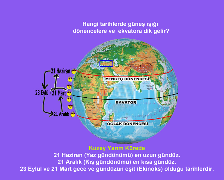 Kuzey Yarım Kürede 21 Haziran (Yaz gündönümü) en uzun gündüz. 21 Aralık (Kış gündönümü) en kısa gündüz. 23 Eylül ve 21 Mart gece ve gündüzün eşit (Ekinoks) olduğu tarihlerdir.